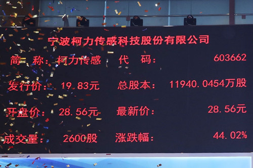 2019年8月6日,柯力傳感(股票代碼:603662)正式在上交所掛牌上市,N柯力以19.83元/股開盤,強(qiáng)勢封漲停板,首日漲幅達(dá)44.02%。公司本次公開發(fā)行2985.0114萬股,發(fā)行市盈率22.98倍,是寧波轄區(qū)在A股上市的第79家企業(yè),是上交所第1488家掛牌企業(yè)。